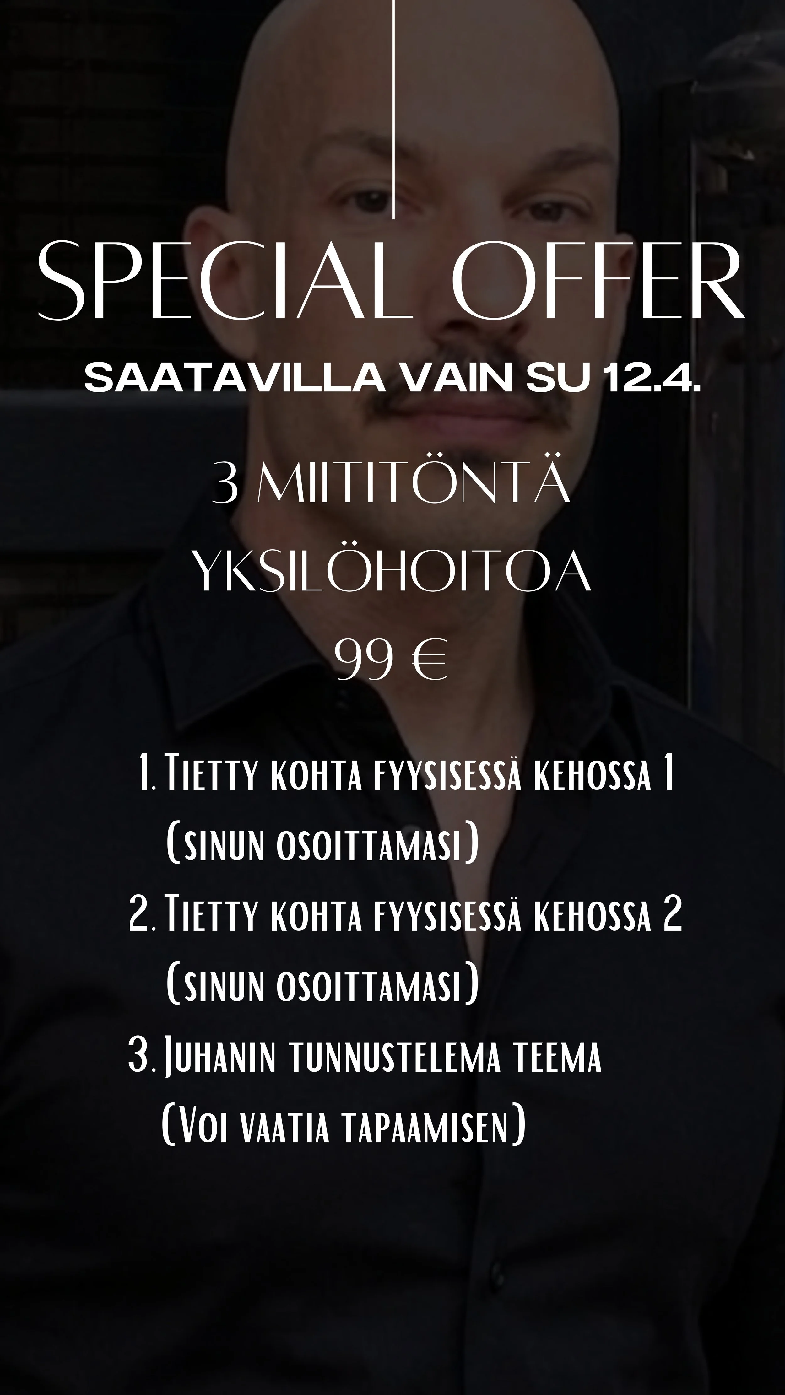 Tunnustelen selvätietoisesti kohdallasi tällä hetkellä ajankohtaisia teemoja, ja muotoilen niistä energiahoitojen sarjan, jonka laitan ehdotuksena sinulle sähköpostiin! Ehdotuksen pyytäminen ei sido sarjan hankkimiseen. Ehdotuksessa saattaa olla mukana myös valmennustapaamisia.